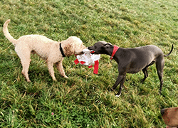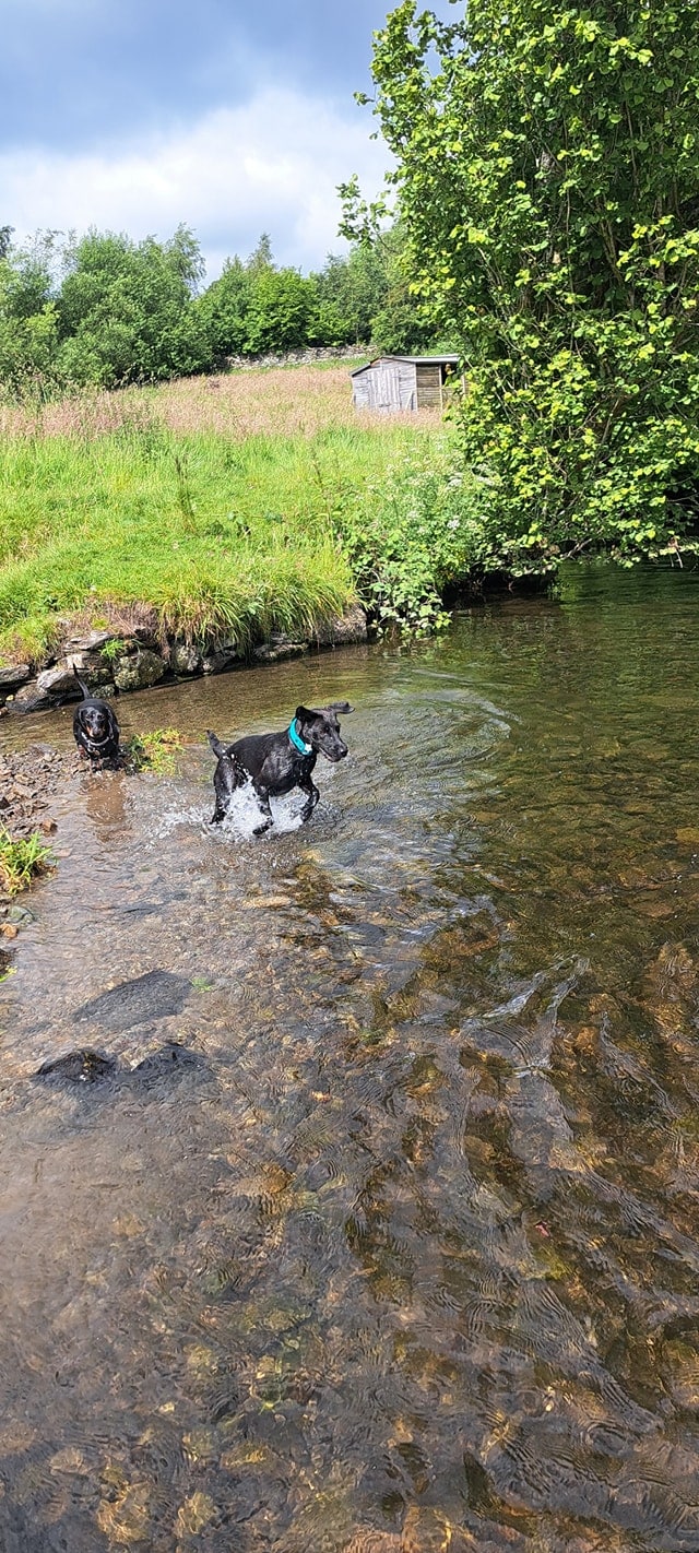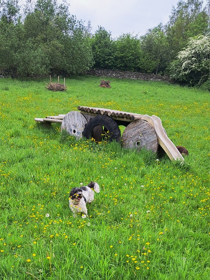At Paws Outdoors Kendal we have 2 separate areas of private land, this means your dog will enjoy off leash exercise along with a small group of dogs. These 2 diverse areas provide enrichment for all breeds, they have the freedom to roam, explore, paddle and enjoy games based training. We have toys, hoops balls, and large equipment including a slide, climbing platform and much more.