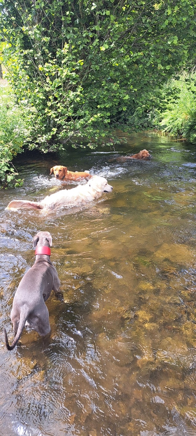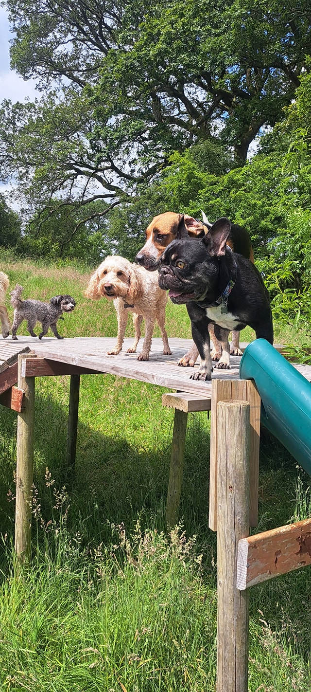 The land has fields, hills, woodland and a stream, which the dogs absolutely love! We have dog toys, ramps, a balance beam, slide and much more. We provide diverse walks and varied activities so your dog will be in their element!